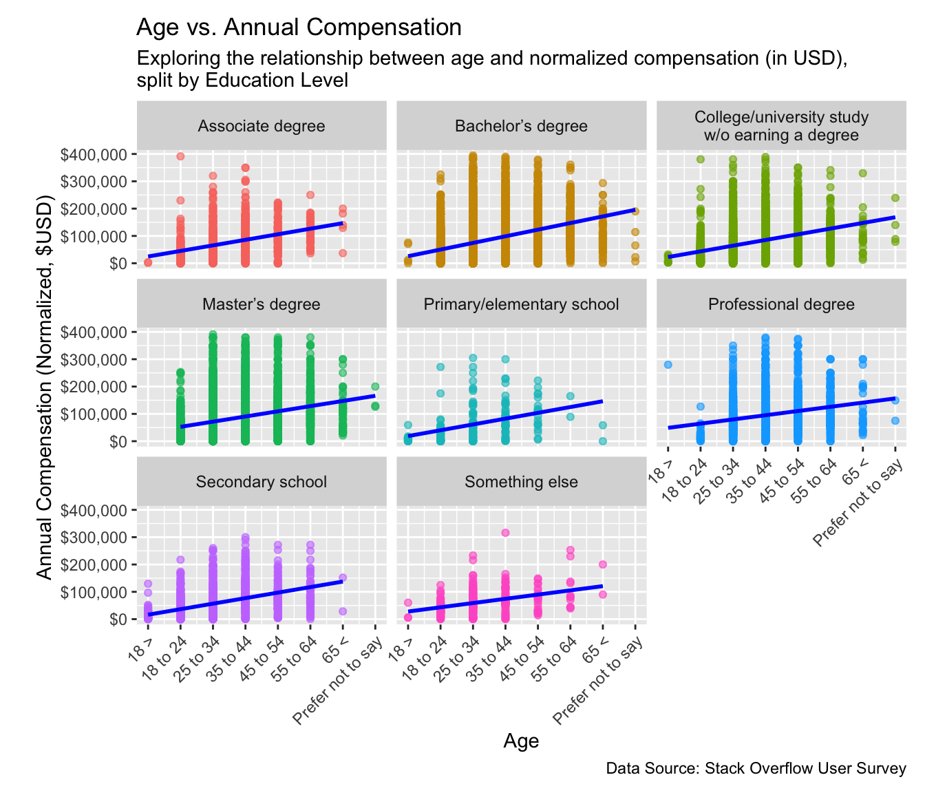 We implemented a scatter plot of developer total normalized compensation faceted by education level, which will help us understand how education level affect total compensation throughout different ages.