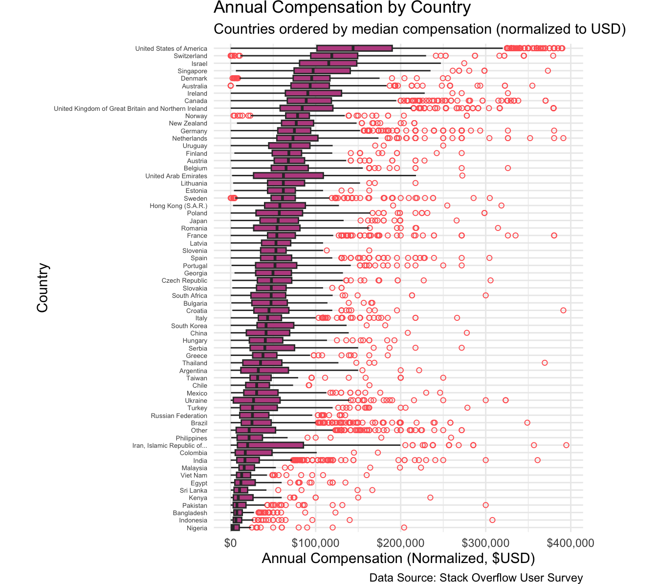 We implemented a box chart of total normalized compensation faceted by country, which will help us understand how developer’s total compensation ranged throughout each country