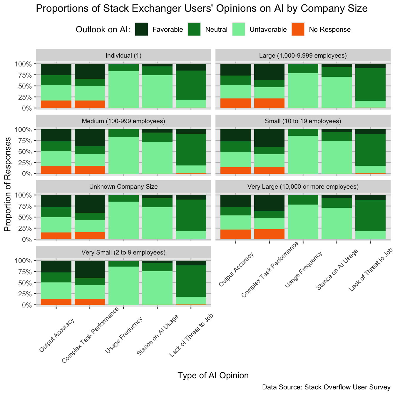 We implemented a stacked Bar Chart of AI Perception faceted by company size, which will help us understand how company size influences developers’ opinions about AI.