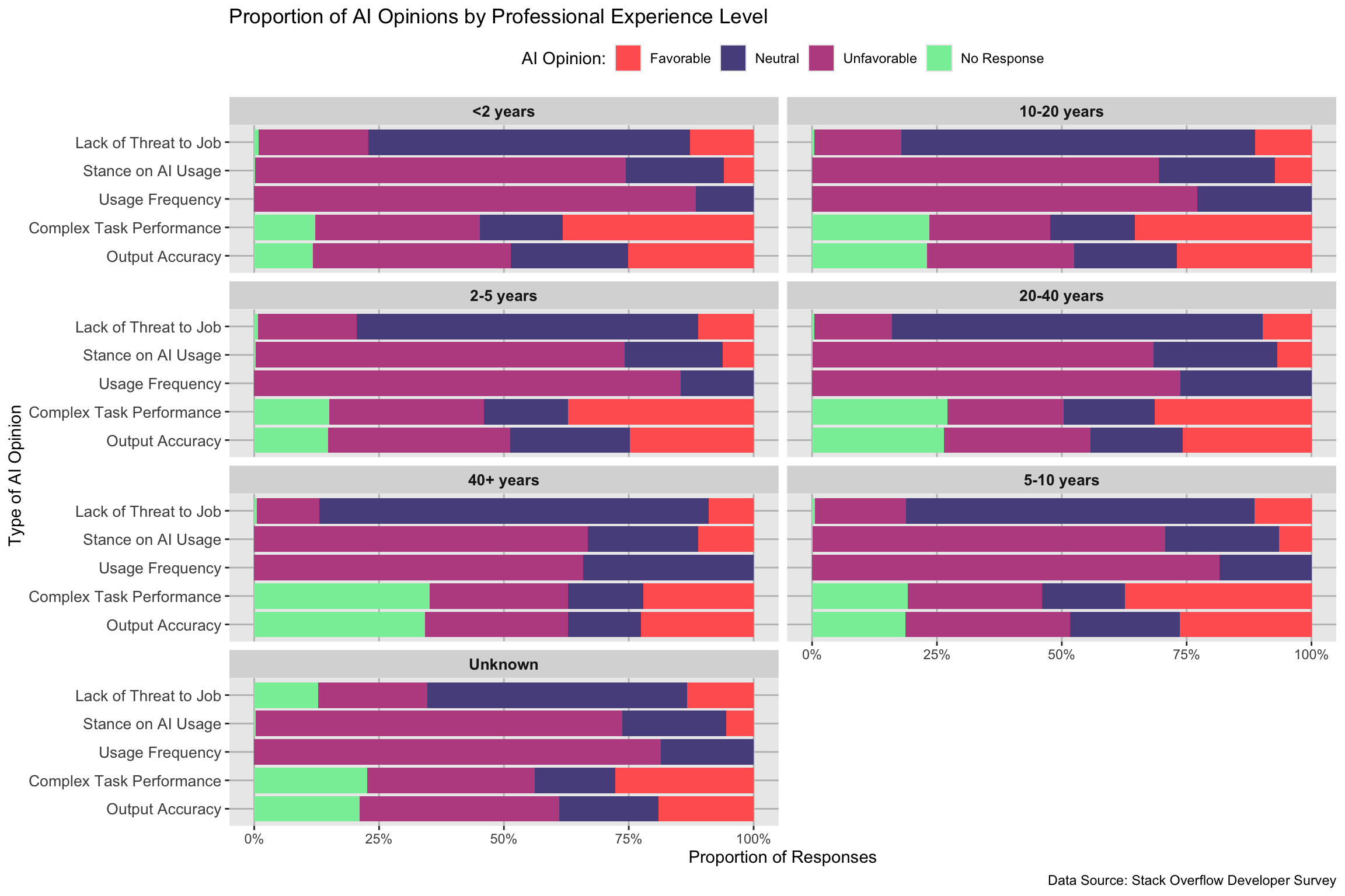 Possible Explanation: Developers across all experience levels likely share a common skepticism toward AI’s role in development, possibly due to concerns about AI-generated code quality, debugging complexity, and AI’s inability to replace human expertise. Additionally, since Stack Overflow is a technical discussion website, its users may naturally view AI as an inferior tool for development or a crutch for less-experienced programmers.
