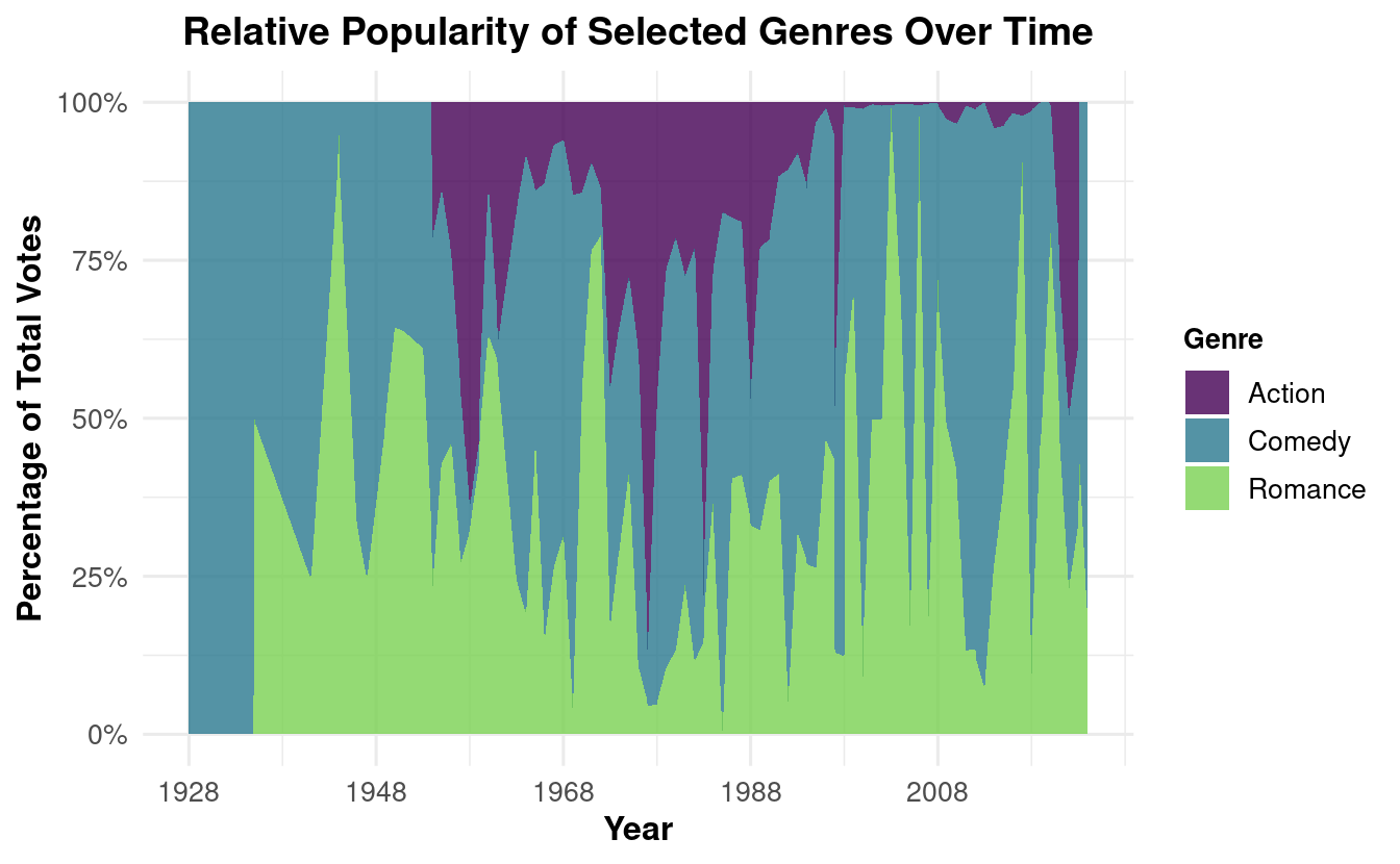 Around 1997 to 2020, comedy and romance dominated heavily over action in terms of popularity.