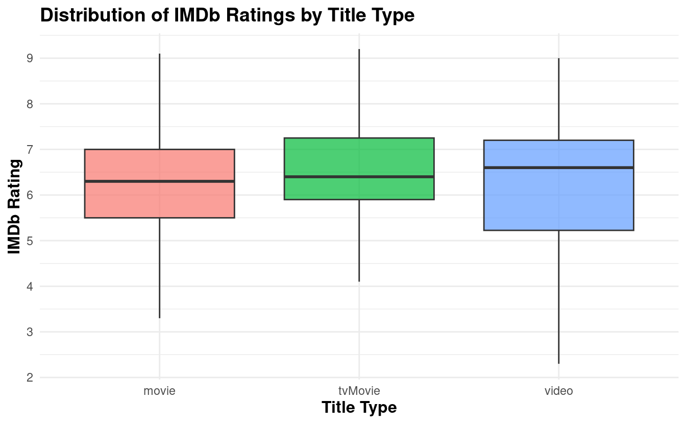 TV movies have a slightly higher median IMDb rating compared to movies and videos, but all three categories show similar overall distributions.