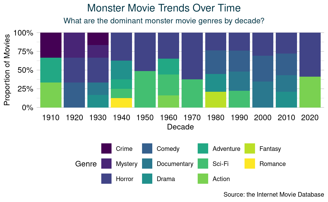 Our project explores trends in monster movies using two datasets: one containing details like titles, release years, ratings, and runtime, and another mapping movies to their respective genres.