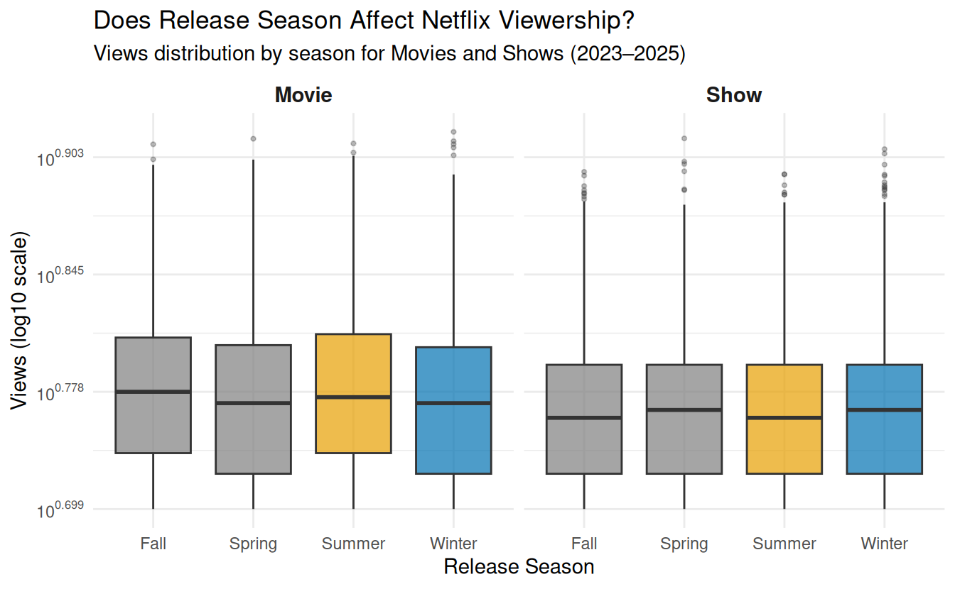 Approach: We examine how release timing relates to Netflix viewership by grouping titles into seasons based on their release_date. Using the views variable as our engagement metric, we compare how average and overall distributions of views differ across seasons for both movies and shows.