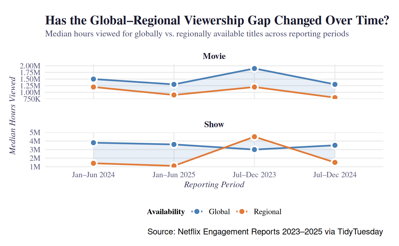 - Global movies dropped from ~1.5M to ~1.25M median hours, while regional held flat around 1M, showing how the gap shrank but never closed