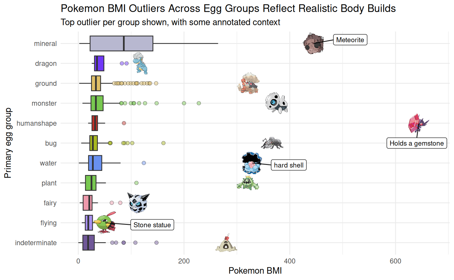 Pokémon BMI (weight/height²) varies by egg group in ways that feel “realistic” overall, and the biggest outliers are explainable by each Pokémon’s design concept.