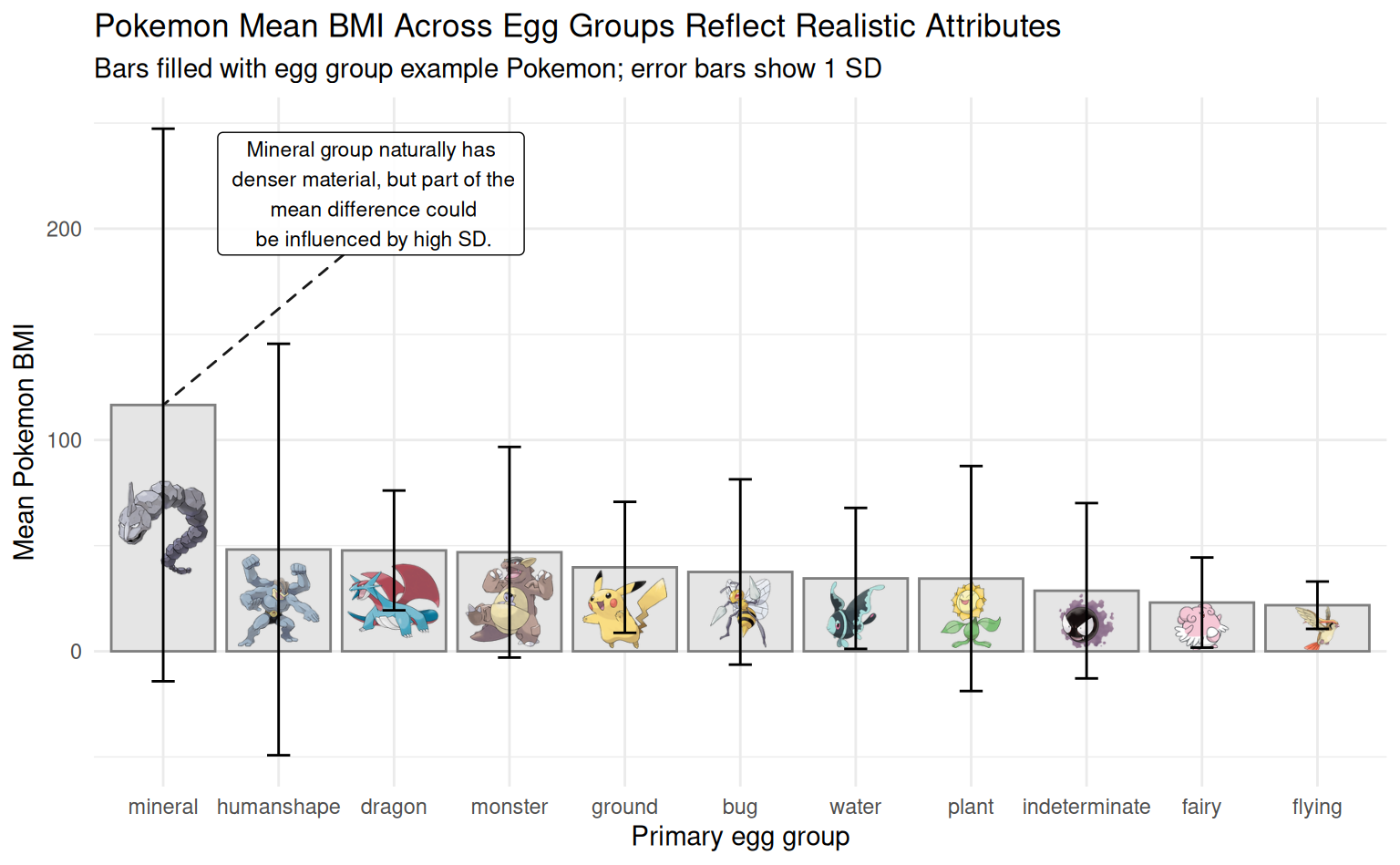 Approach: We compute a BMI-style index (weight/height²) and use two plots—mean ± SD and distribution/outliers—to compare “heaviness-for-size” across Pokémon egg groups.
