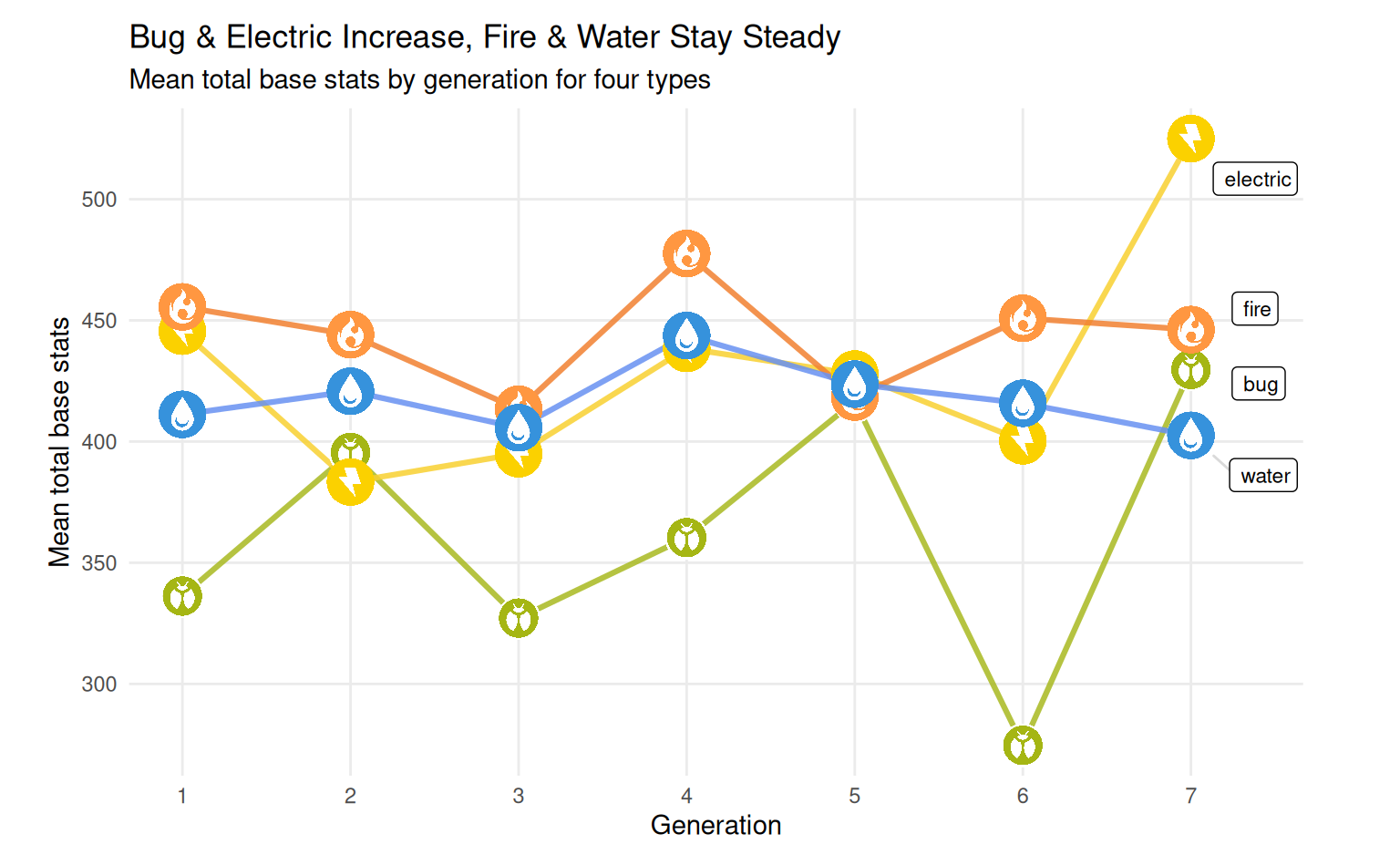 Figure 4: Select 4 types from Figure 3; 2 biggest risers (Bug, Electric) and 2 most flat (Fire, Water) to show changes unfolding over generations