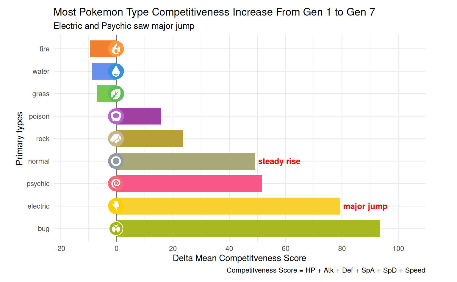 Figure 3: Change in mean competitiveness from Gen 1 → Gen 7 by type (Delta of mean total base stats)