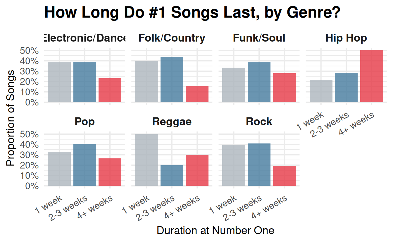- Hip Hop: nearly 50% of its #1 songs hold for 4+ weeks