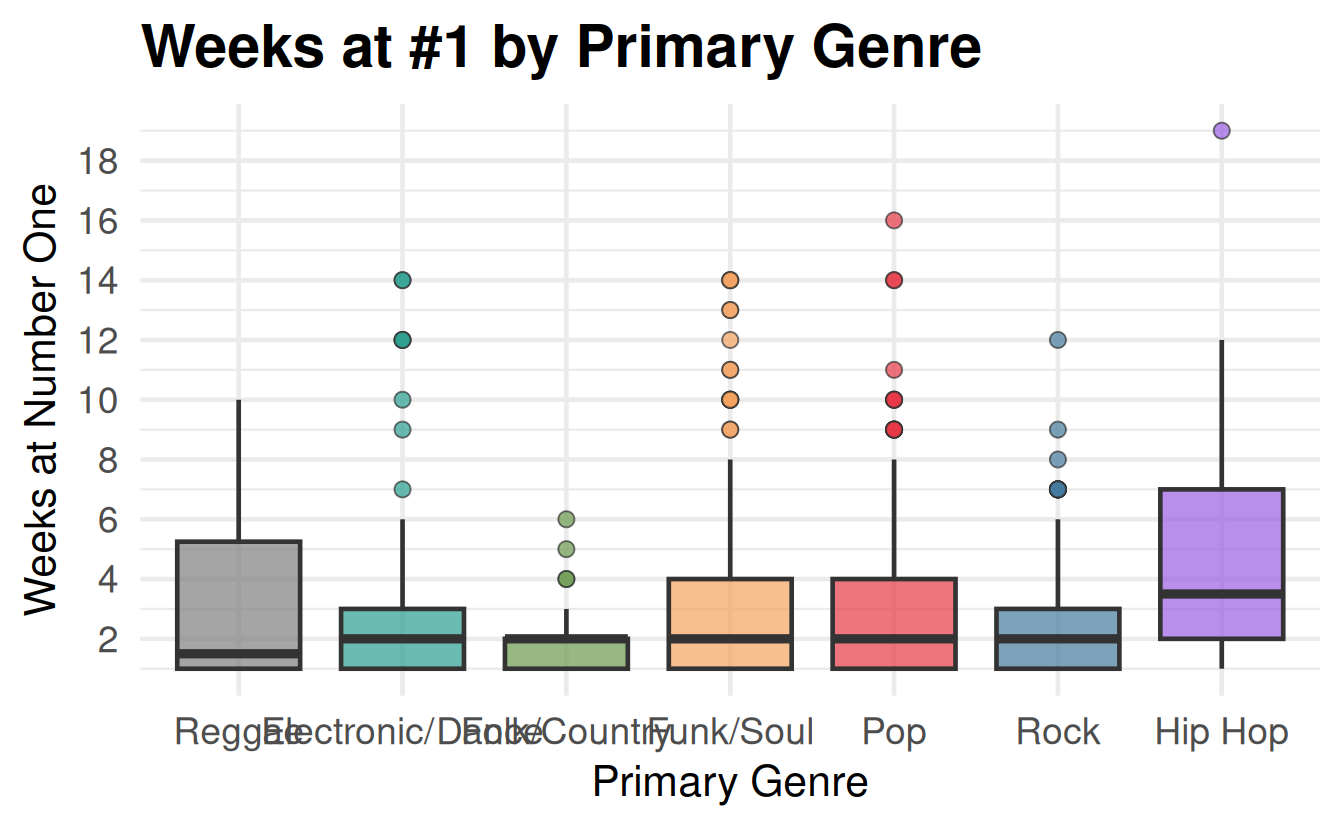 - Hip Hop has the highest median weeks at #1 (4 weeks vs. 2 for most others)