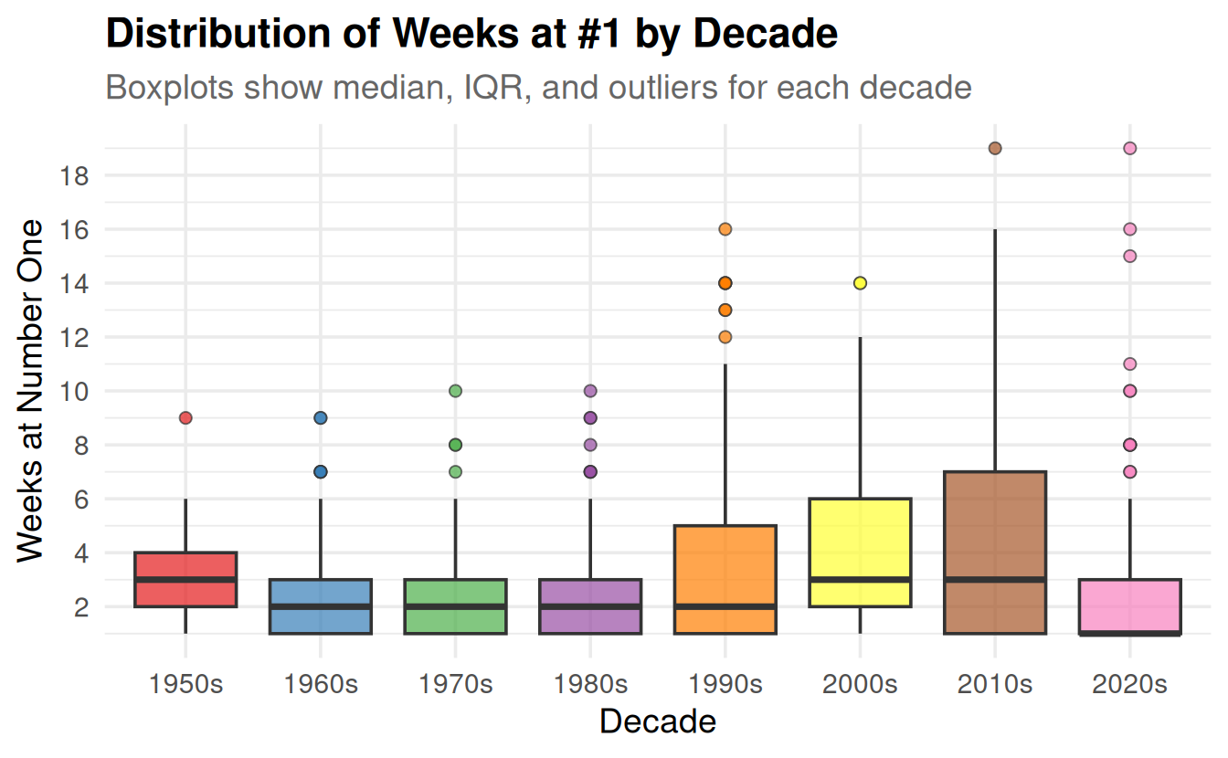 - The 1990s and 2000s have the highest medians and most extreme outliers, with songs holding #1 for 14–16 weeks