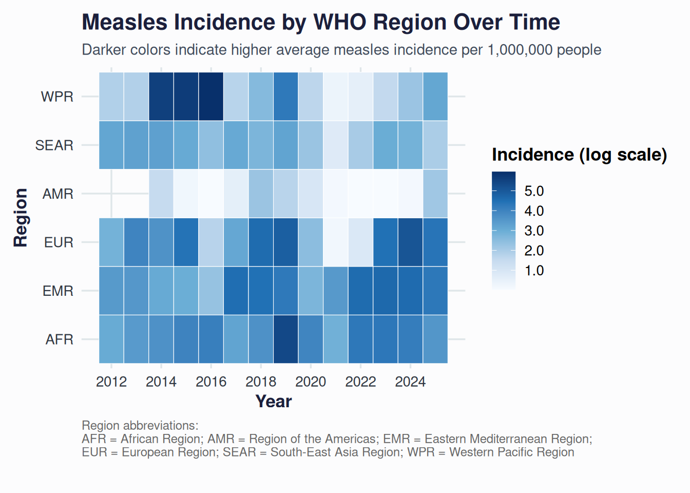 - Measles incidence varies across regions and over time. Some regions (such as Africa and the Eastern Mediterranean) often show higher incidence, while the Americas generally remain lower.