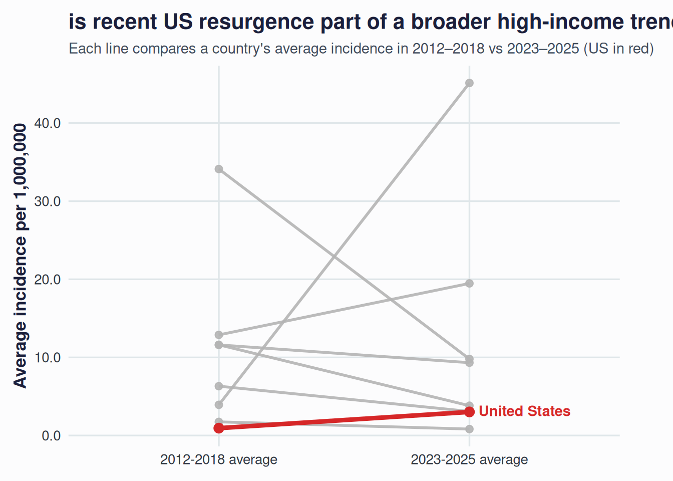 To evaluate whether the recent US resurgence is part of a broader trend among high-income countries, we create a slope chart comparing the average measles incidence in an earlier period (2012–2018) with a recent period (2023–2025). Each line represents one high-income country, and the US is highlighted in red to make it easier to compare with other countries. A slope chart works well for this comparison because it clearly shows the direction and magnitude of change between two time periods. By looking at whether most lines slope upward or downward, we can easily see whether the increase in the US is unique or shared by other high-income countries.