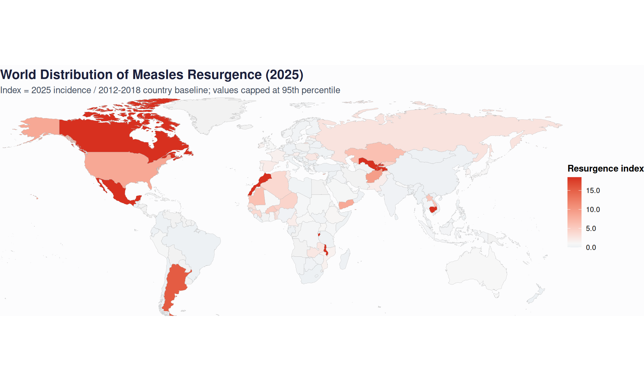 Interpretation. The map shows that measles resurgence in 2025 is not evenly distributed across the world. Several countries with higher resurgence values appear in the same geographic areas, such as parts of North America, South America, Central Asia, and Southeast Asia. This pattern suggests that resurgence tends to occur in regional clusters rather than isolated countries.