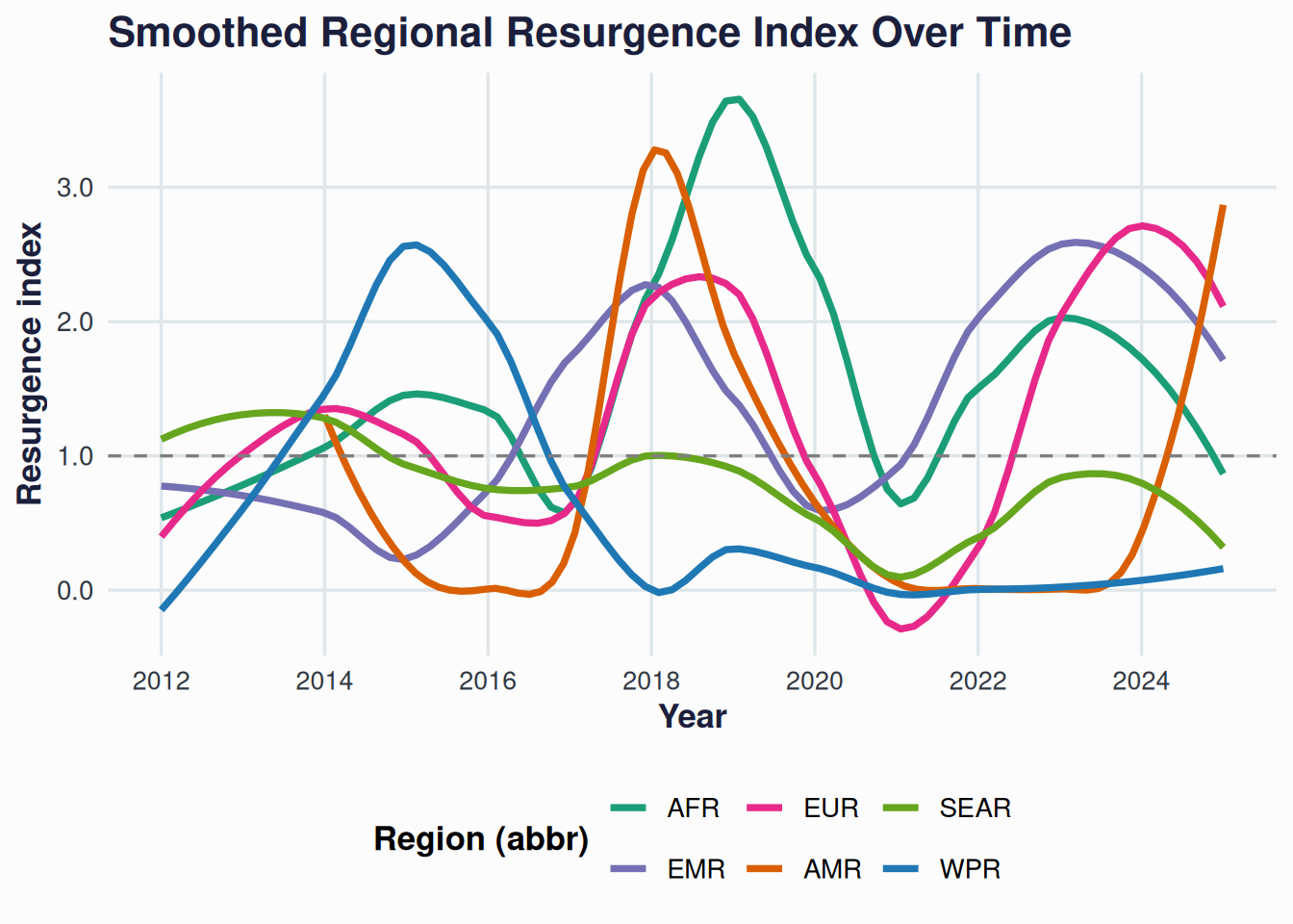 Interpretation. The smoothed timeline chart shows how the resurgence index changes over time for each WHO region. The dashed horizontal line at 1 represents the baseline level; values above this line indicate higher incidence than the historical baseline. Several regions show increases above the baseline during similar time periods, especially around 2018–2019 and again around 2023–2024, suggesting that some resurgence waves occur across multiple regions at roughly the same time. However, the peaks and timing are not identical for every region. Some regions increase earlier or later than others, and a few regions drop below the baseline during certain years. This suggests that measles resurgence is partially synchronized across regions but not perfectly aligned, meaning that global factors may influence outbreaks while regional conditions still shape the timing and intensity of resurgence.