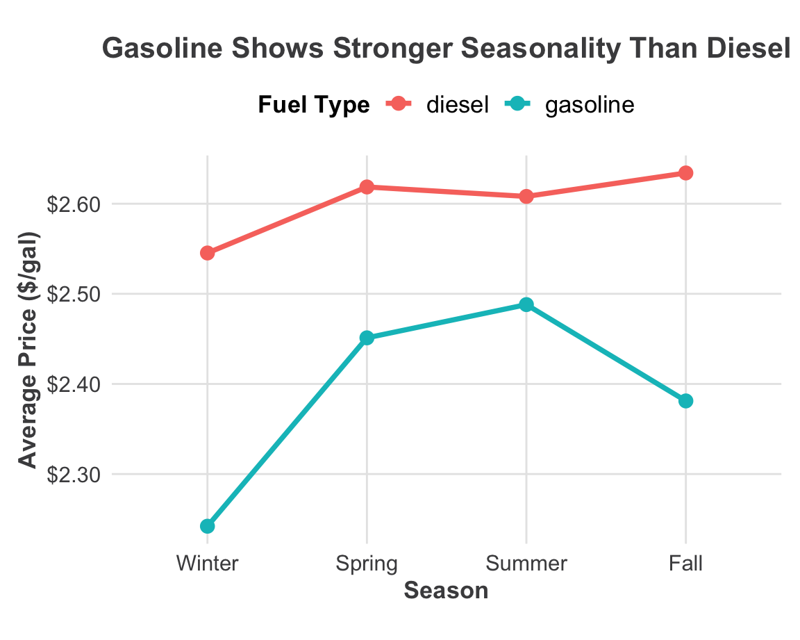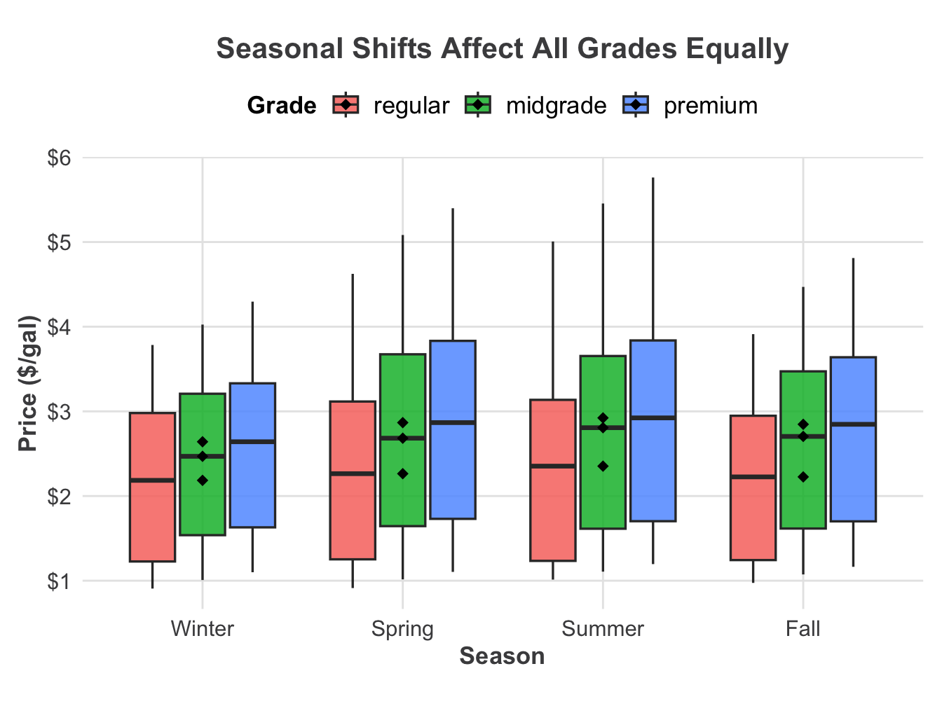 How do prices vary by season across fuel type and gasoline grade?