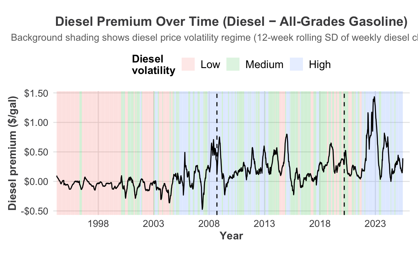 How does the diesel premium evolve over time, and how does it relate to price volatility?