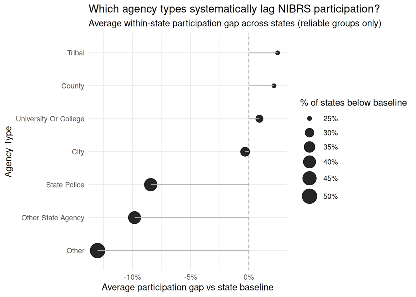 The aggregated dot plot reveals a consistent pattern: “Other”, “Other State Agency”, and State Police agencies participate at lower rates than the state baseline, while Tribal and County agencies tend to exceed it. Notably, the large dot sizes for the lagging categories indicate these gaps are not small-sample cases but widespread tendencies that hold across many states. One possible explanation is that catch-all agency types like “Other” lack the institutional infrastructure or federal pressure that more formally defined agencies face, making standardized reporting adoption slower and more uneven.
