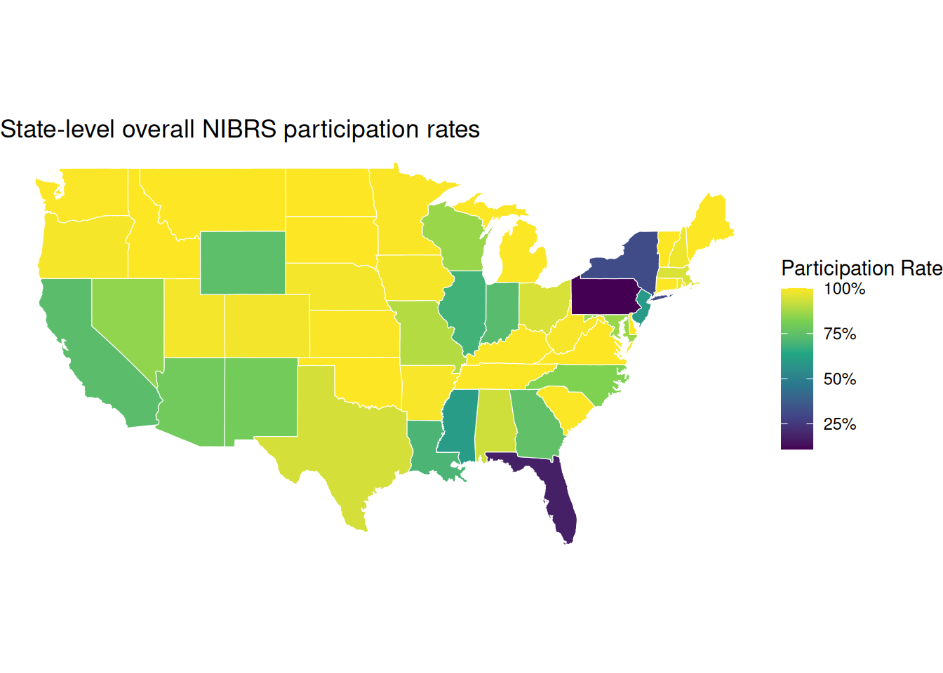 The choropleth map adds an important layer to this picture. Participation is largely a state-level story: most western states report near-universal adoption while Pennsylvania and Florida stand out as notable laggards. This confirms that state mandates and infrastructure play a significant role in driving overall participation rates, which is precisely why controlling for state was essential in the first place. Without that control, agency-type gaps could easily be mistaken for geographic ones.