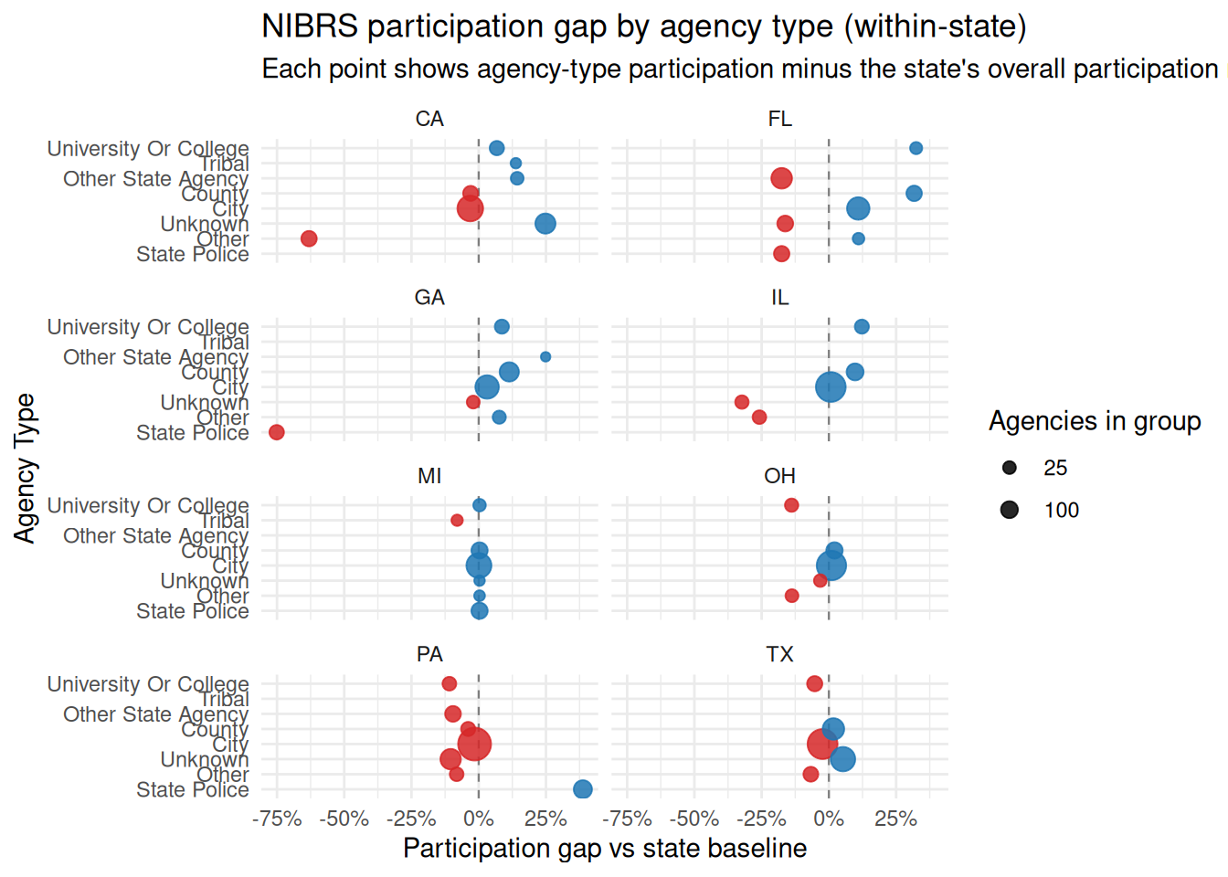 subtitle = "Each point shows agency-type participation minus the state's overall participation rate (top 8 states by agencies)",