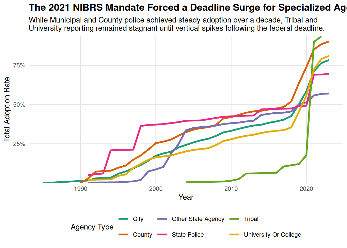 subtitle = "While Municipal and County police achieved steady adoption over a decade, Tribal and \nUniversity reporting remained stagnant until vertical spikes following the federal deadline.",
