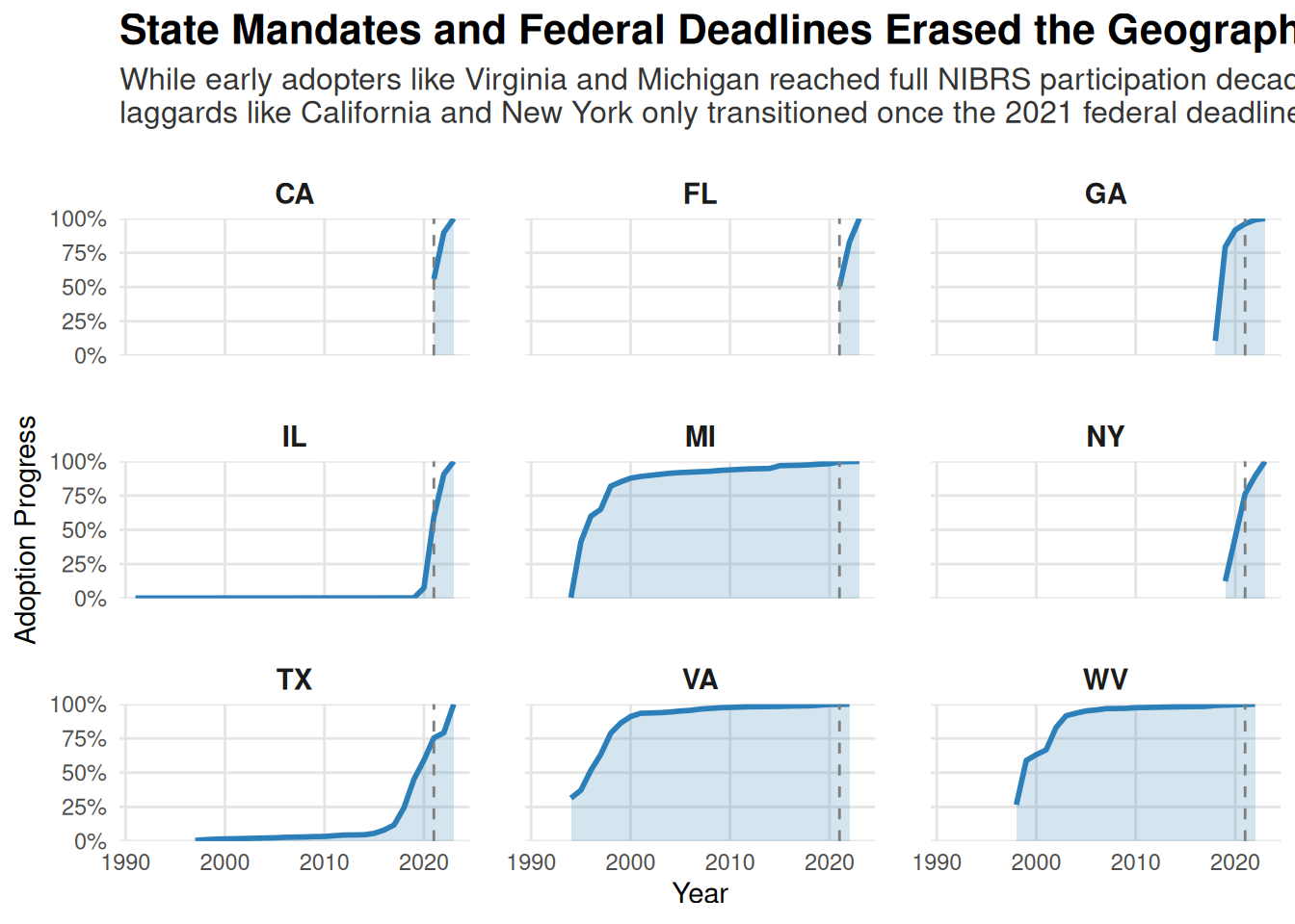 subtitle = "While early adopters like Virginia and Michigan reached full NIBRS participation decades ago,\nlaggards like California and New York only transitioned once the 2021 federal deadline arrived.",