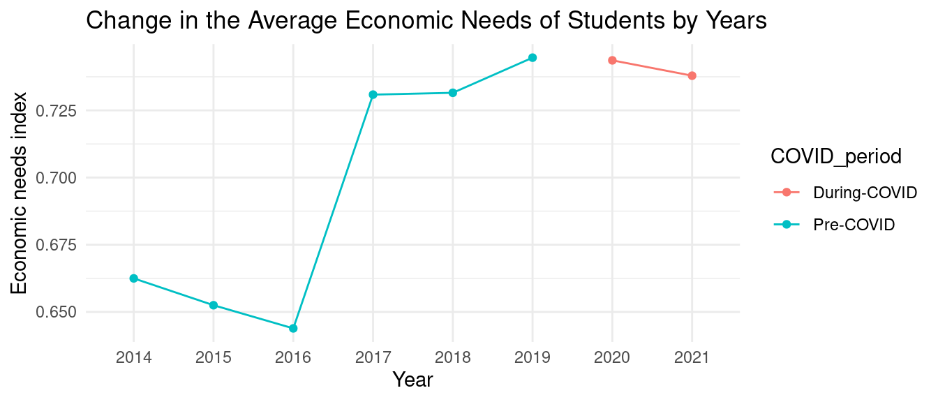 Analysis: The mean economic need index showed a gradual increase from 2014 to 2019, indicating a rising trend in economic need over these years. In the Pre-COVID period, the economic need index peaked at 0.745 in 2019. During the COVID period, it was slightly lower but still relatively high, at 0.744 in 2020 and 0.738 in 2021. The plot for mean economic need shows a gradual increase over the years, with a slight decrease during the COVID-19 period but still remaining at relatively high levels.