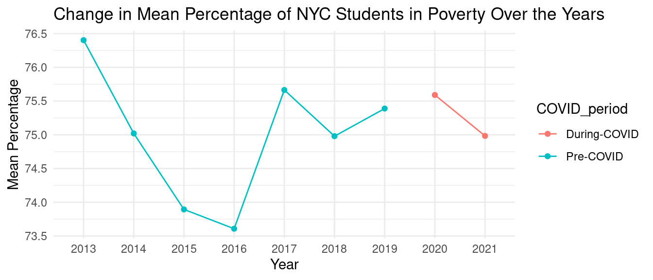 Analysis: The plot for mean percent poverty demonstrates the stability in poverty levels over the years, with no significant spikes during the COVID-19 period.