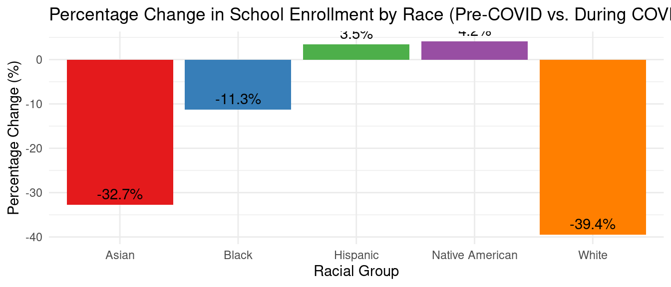 Analysis: Disproportionate Impact: The data suggests a disproportionate impact of COVID-19 on school enrollment among different racial groups. White and Asian student populations experienced significant decreases, while Hispanic and Native American groups saw slight increases.