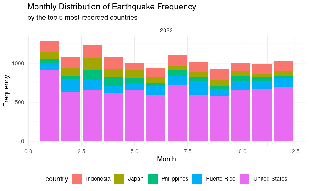Motivation: Earthquake is one of the most devastating natural disasters on this planet, destroying properties and ending lives. It is important to understand how many earthquakes are happening each month and how powerful they are. Investigating the proposed question will allow us to have a better understanding of how earthquakes are influencing our lives.