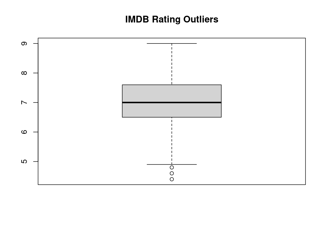 # Remove rows with missing values, if necessaryblockbusters <- blockbusters %>%drop_na()# Check for outliers in numerical variablesboxplot(blockbusters$imdb_rating, main ="IMDB Rating Outliers")