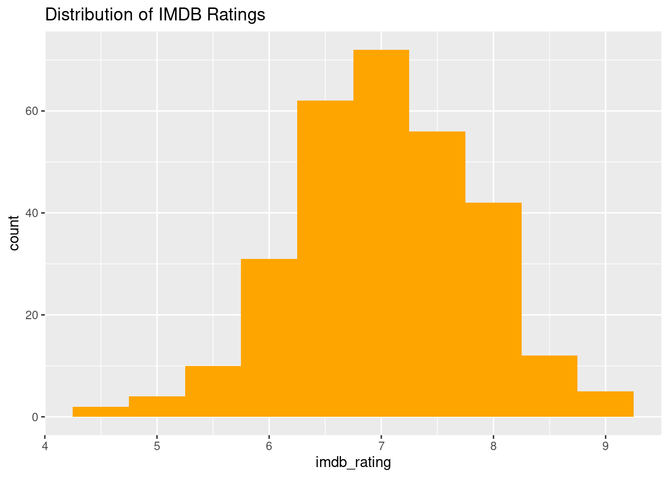 # Histogram of IMDB Ratingsggplot(blockbusters, aes(x = imdb_rating)) +geom_histogram(binwidth =0.5, fill ="orange") +labs(title ="Distribution of IMDB Ratings")