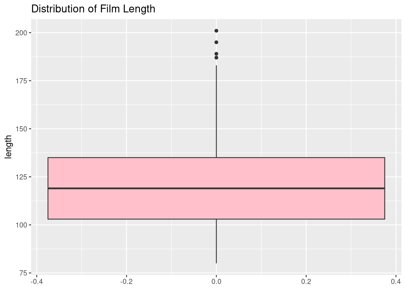 # Boxplot of Film Lengthggplot(blockbusters, aes(y = length)) +geom_boxplot(fill ="pink") +labs(title ="Distribution of Film Length")