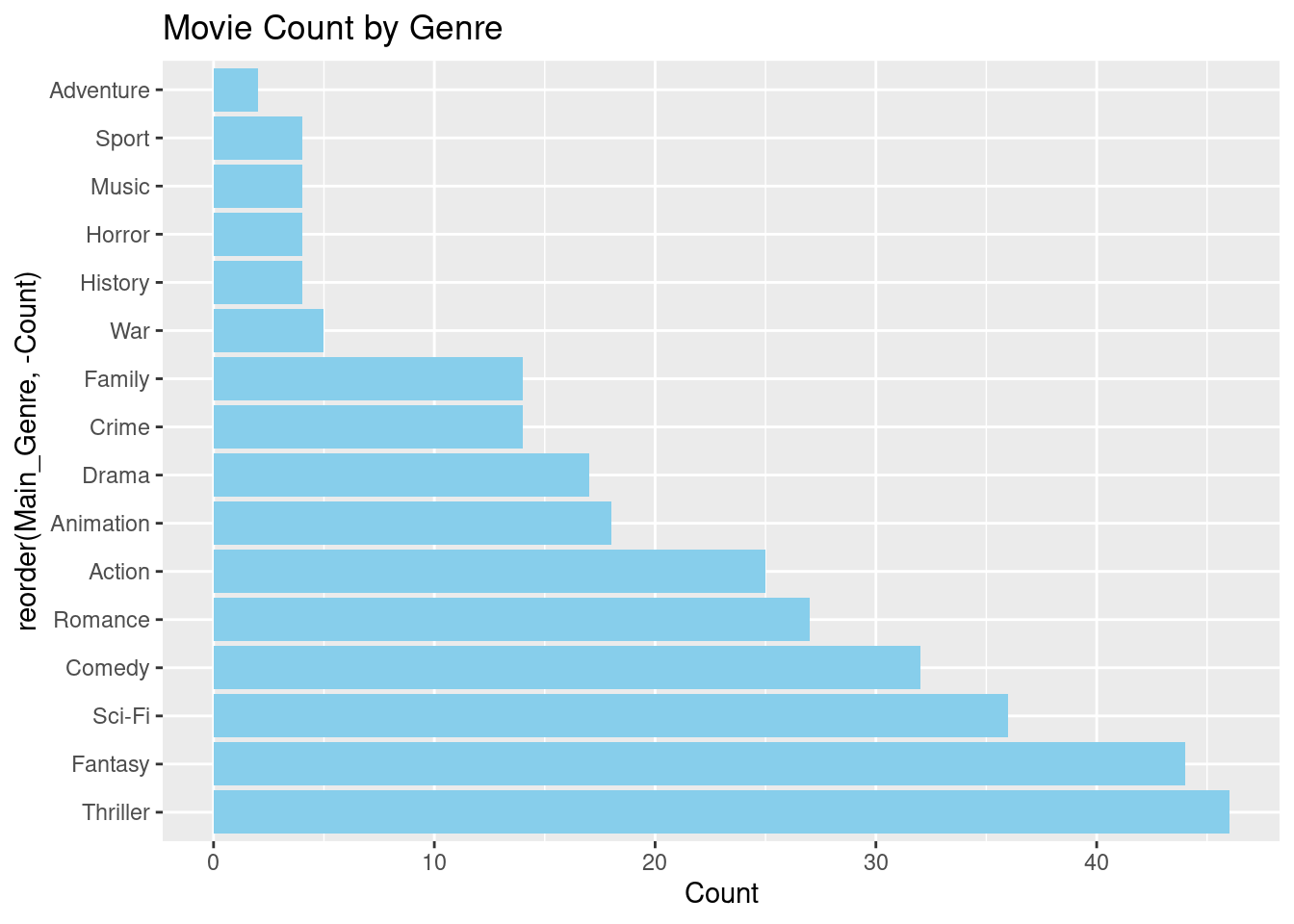 # Count of movies by genregenre_count <- blockbusters %>%group_by(Main_Genre) %>%summarise(Count =n()) %>%arrange(desc(Count))# Bar plot of movie count by genreggplot(genre_count, aes(x =reorder(Main_Genre, -Count), y = Count)) +geom_bar(stat ="identity", fill ="skyblue") +coord_flip() +labs(title ="Movie Count by Genre")