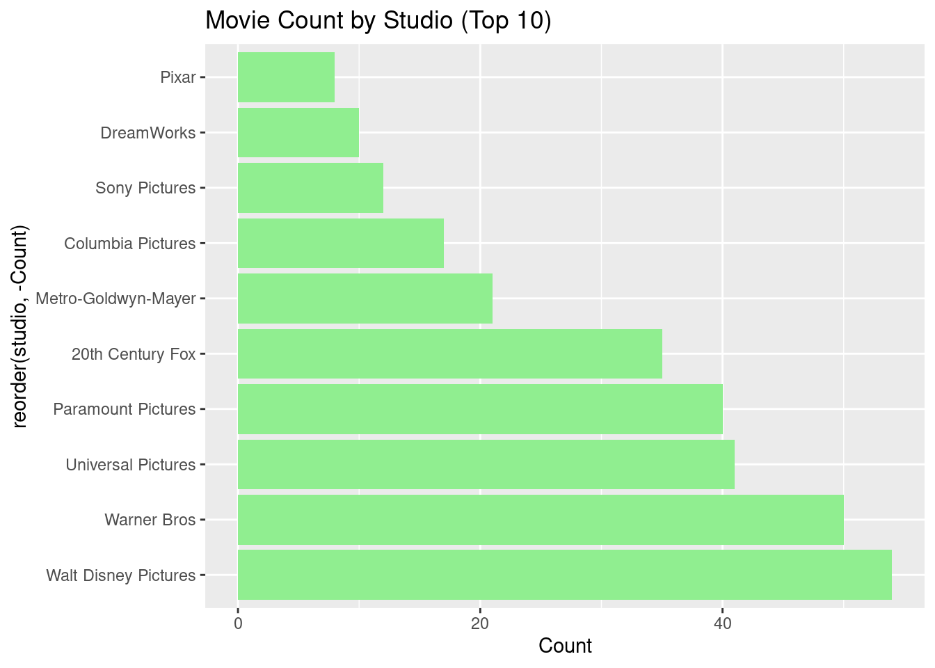 # Count of movies by studiostudio_count <- blockbusters %>%group_by(studio) %>%summarise(Count =n()) %>%arrange(desc(Count)) %>%top_n(10)# Bar plot of movie count by studioggplot(studio_count, aes(x =reorder(studio, -Count), y = Count)) +geom_bar(stat ="identity", fill ="lightgreen") +coord_flip() +labs(title ="Movie Count by Studio (Top 10)")