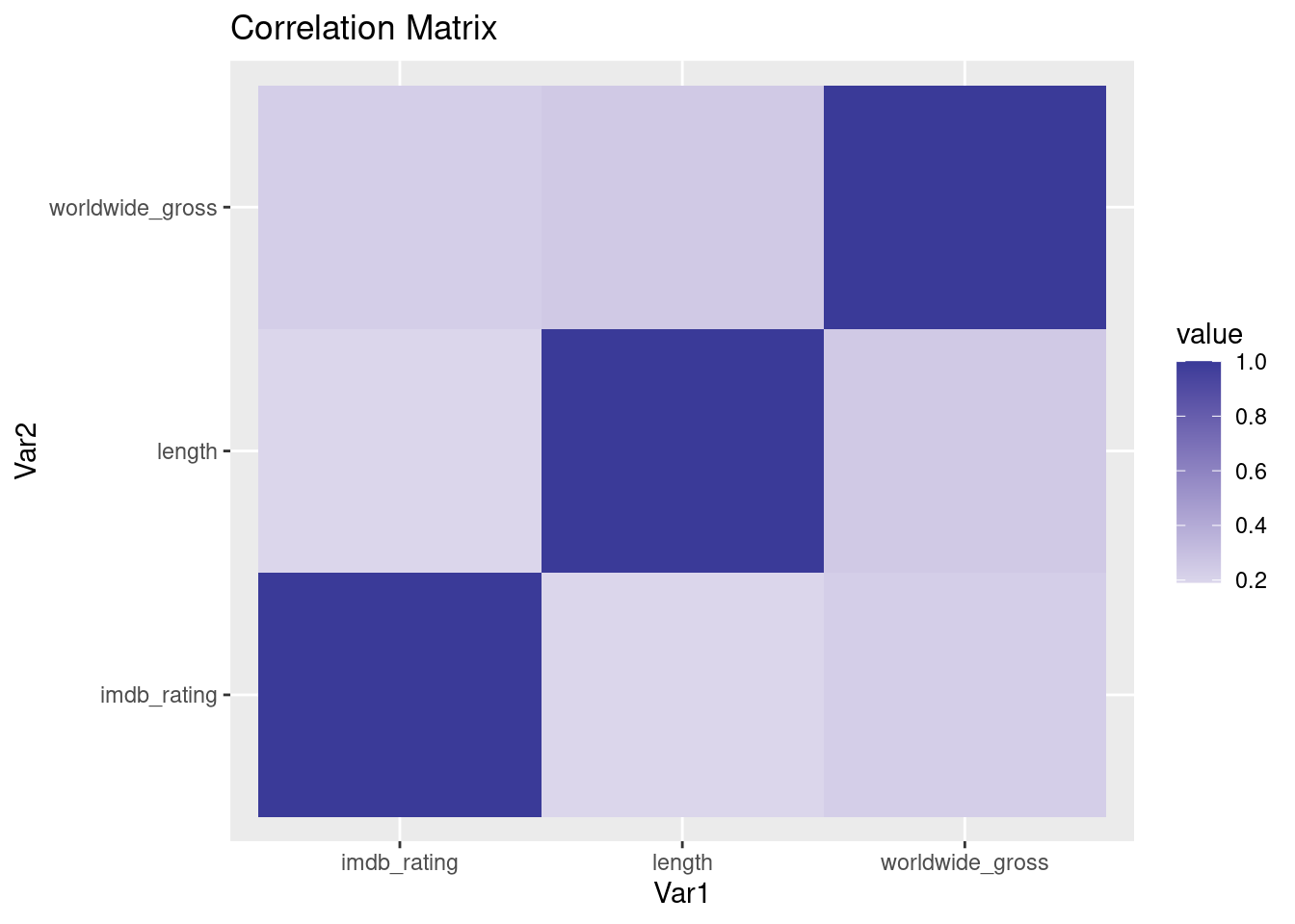 # Remove commas and dollar signs from "worldwide_gross" and convert to numericblockbusters$worldwide_gross <-as.numeric(gsub("[\\$,]", "", blockbusters$worldwide_gross))# Calculate the correlation matrix (with automatic handling of missing values)correlation_matrix <-cor(select(blockbusters, imdb_rating, length, worldwide_gross))corr_matrix_melted <-melt(correlation_matrix)corr_plot <-ggplot(corr_matrix_melted, aes(Var1, Var2, fill = value)) +geom_tile() +scale_fill_gradient2() +labs(title ="Correlation Matrix")# Display the heatmapprint(corr_plot)
