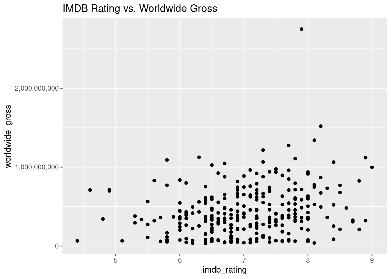 # Remove commas and dollar signs from "worldwide_gross" and convert to numericblockbusters$worldwide_gross <-as.numeric(gsub("[\\$,]", "", blockbusters$worldwide_gross))# Scatter plot to explore relationships (e.g., IMDB rating vs. Worldwide Gross)ggplot(blockbusters, aes(x = imdb_rating, y = worldwide_gross)) +geom_point() +labs(title ="IMDB Rating vs. Worldwide Gross") +scale_y_continuous(labels = comma)