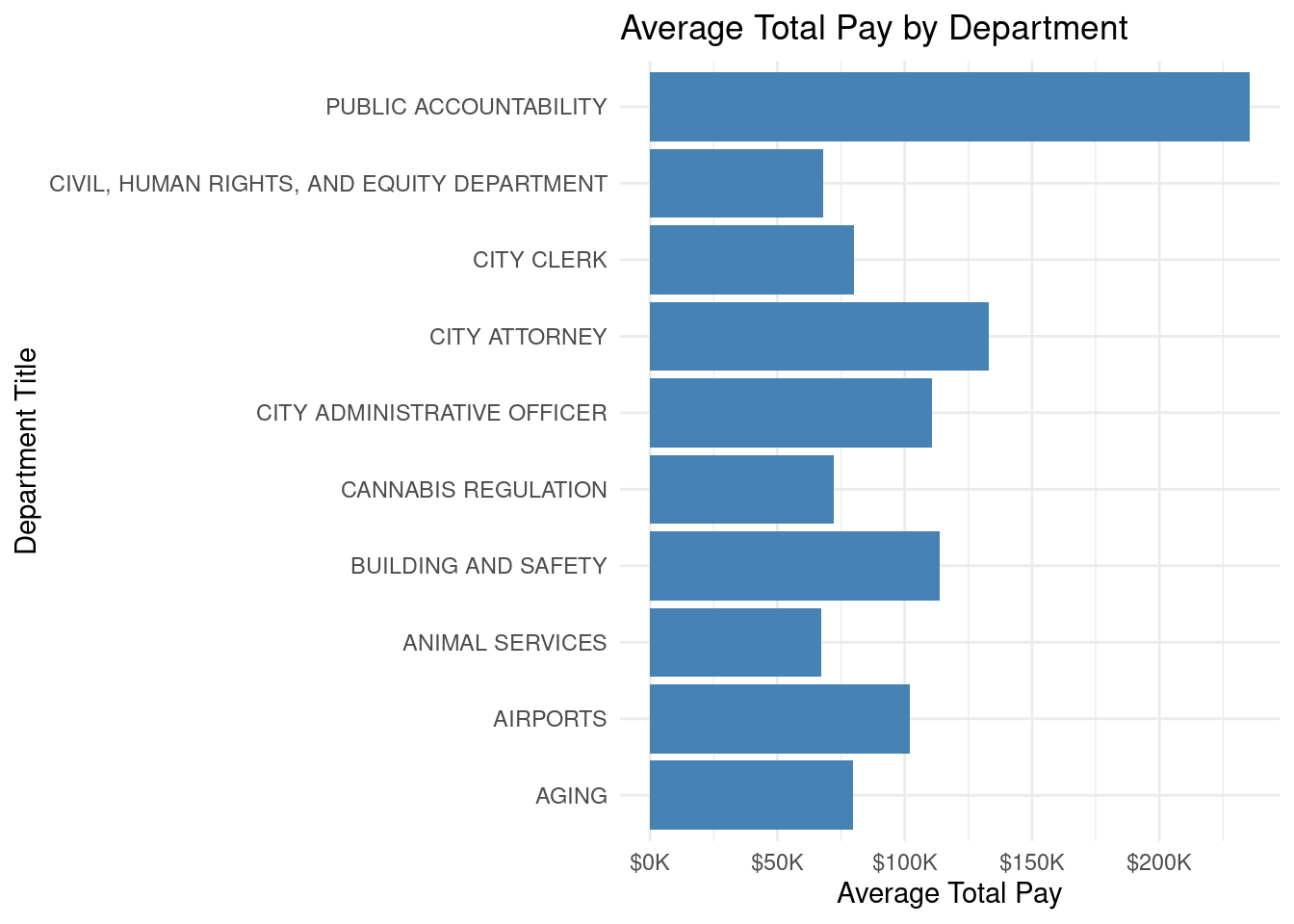 # Calculate the average total pay for each categoryavg_department <- payroll_2022 |>group_by(DEPARTMENT_TITLE) |>summarize(avg_total_pay =mean(TOTAL_PAY))avg_gender <- payroll_2022 |>group_by(GENDER) |>summarize(avg_total_pay =mean(TOTAL_PAY))avg_ethnicity <- payroll_2022 |>group_by(ETHNICITY) |>summarize(avg_total_pay =mean(TOTAL_PAY))