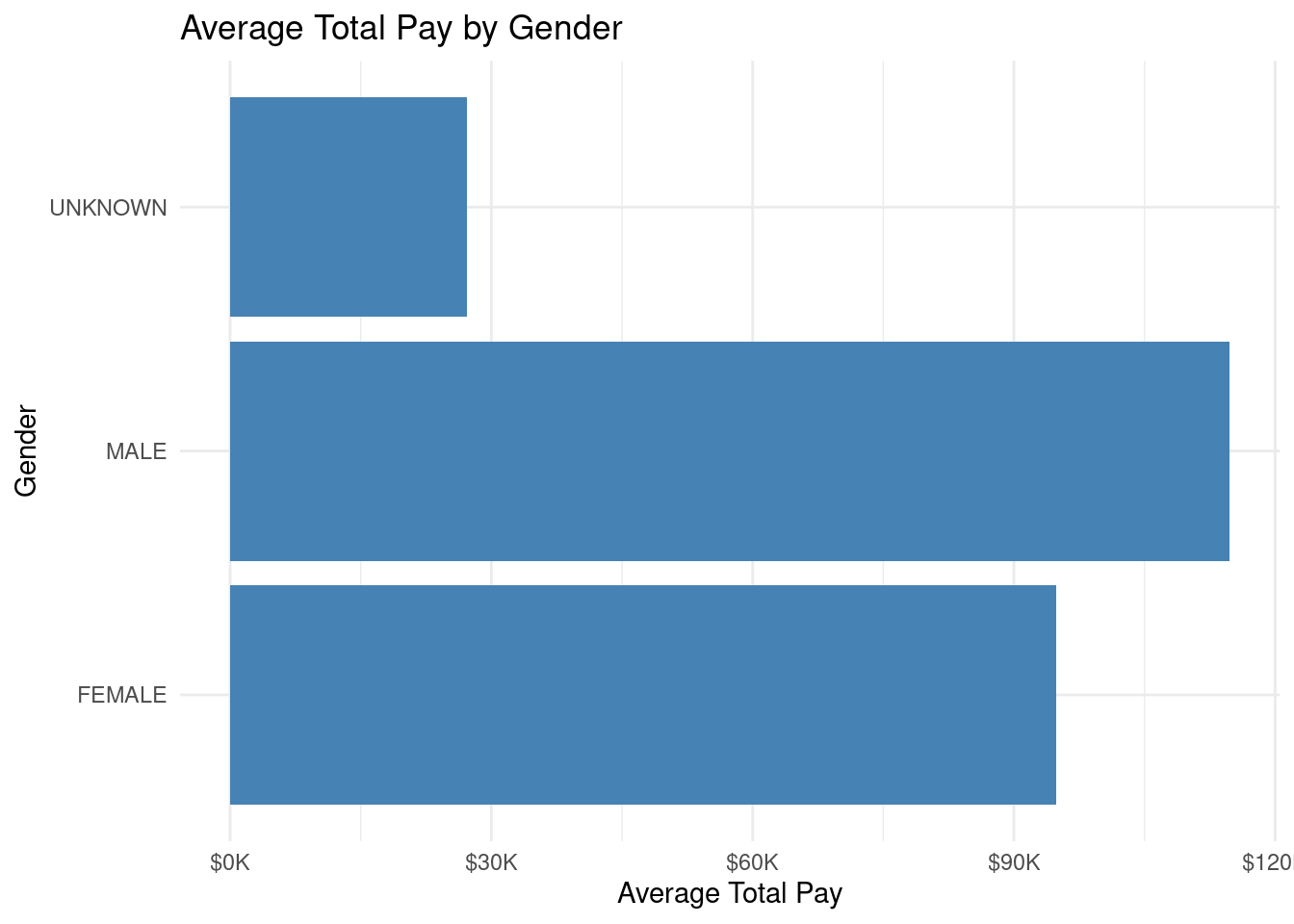 ggplot(avg_gender, aes(x = avg_total_pay, y = GENDER)) +geom_col(fill ="steelblue") +scale_x_continuous(labels = scales::dollar_format(scale =1e-3, suffix ="K")) +labs(x ="Average Total Pay",y ="Gender",title ="Average Total Pay by Gender" ) +theme_minimal()