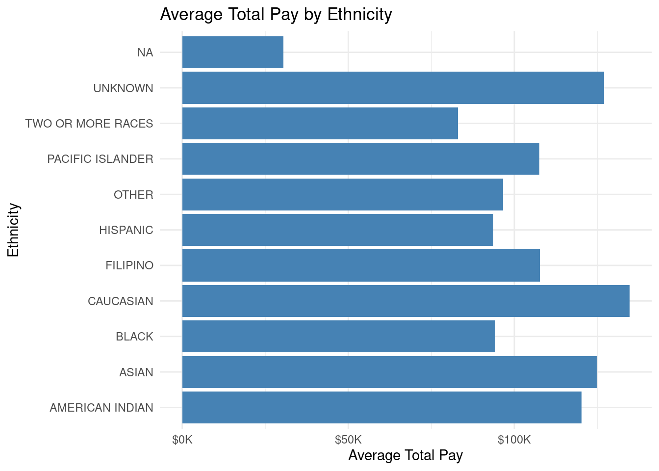 ggplot(avg_ethnicity, aes(x = avg_total_pay, y = ETHNICITY)) +geom_col(fill ="steelblue") +scale_x_continuous(labels = scales::dollar_format(scale =1e-3, suffix ="K")) +labs(x ="Average Total Pay",y ="Ethnicity",title ="Average Total Pay by Ethnicity" ) +theme_minimal()