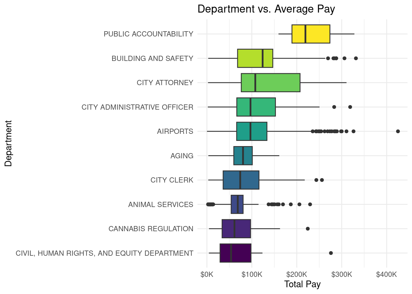 department_total_pay <- payroll_2022 |>select(DEPARTMENT_TITLE, TOTAL_PAY) |>mutate(DEPARTMENT_TITLE =reorder(DEPARTMENT_TITLE, TOTAL_PAY, FUN = median))ggplot(department_total_pay, aes(x = TOTAL_PAY, y = DEPARTMENT_TITLE, fill = DEPARTMENT_TITLE)) +geom_boxplot(show.legend =FALSE) +labs(title ="Department vs. Average Pay",x ="Total Pay",y ="Department") +scale_x_continuous(labels = scales::dollar_format(scale =1e-3, suffix ="K")) +scale_fill_viridis_d() +theme_minimal()