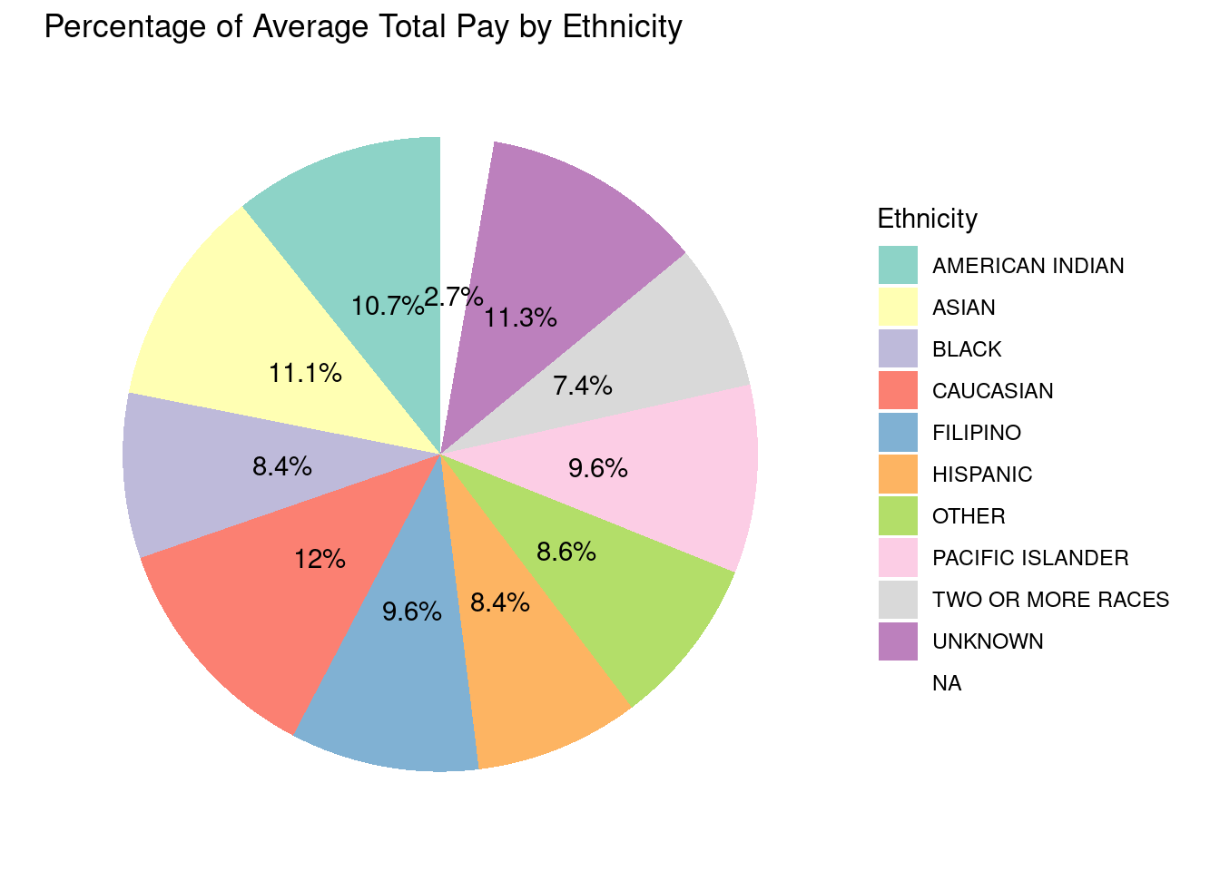 # Calculate the total average paytotal_avg_pay <-sum(avg_ethnicity$avg_total_pay)# Calculate the percentage for each ethnicityavg_ethnicity$percentage <- (avg_ethnicity$avg_total_pay / total_avg_pay) *100# Create the pie chartggplot(avg_ethnicity, aes(x ="", y = percentage, fill = ETHNICITY)) +geom_bar(stat ="identity", width =1) +coord_polar(theta ="y") +scale_fill_brewer(palette ="Set3") +# Optional: Adds a color palettelabs(x ="",y ="",title ="Percentage of Average Total Pay by Ethnicity",fill ="Ethnicity" ) +theme_minimal() +theme(axis.line =element_blank(),axis.text =element_blank(),axis.ticks =element_blank(),axis.title =element_blank(),panel.grid =element_blank()) +geom_text(aes(label =paste0(round(percentage, 1), "%")), position =position_stack(vjust =0.5))