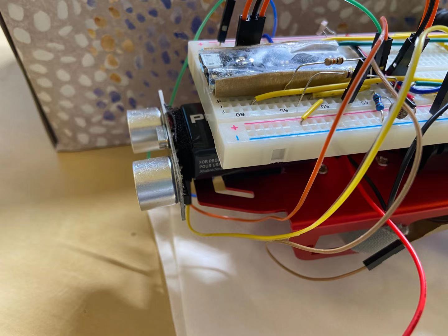The first step is to physically mount the ultrasonic sensor to the robot. The ultrasonic sensor needs to be on the front of the robot facing forward, so we adjusted the position of the 9V battery and the breadboard to give enough space for the ultrasonic sensor, and we used Velco to affix the ultrasonic sensor to the 9V battery. The figure below shows the physical location of the ultrasonic sensor on the robot.