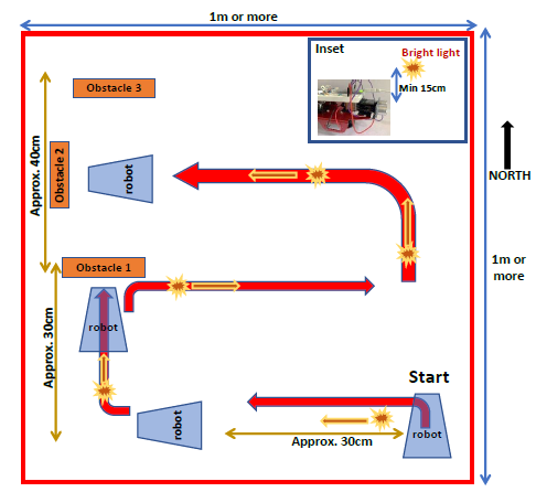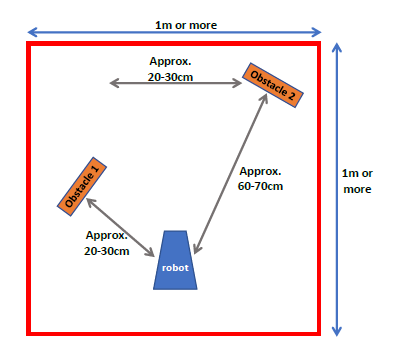 The overall objective for demo 1 is straightforward. The robot starts still with its onboard LED being off. The robot’s initial position are relative to two obstacles as shown in the figure below.