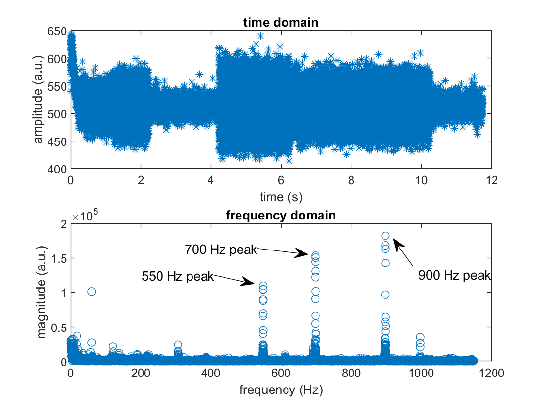 First, we characterized the music file that is played and plot the spectrum of it by sampling sound signal on the Arduino and sending it to the computer MATLAB for FFT and plotting as in lab 3. The figure below shows the time domain and frequency domain signal. We can observe that there are mainly three peaks at 550 Hz, 700 Hz, and 900 Hz. This convinces us that 550 Hz should be the strongest signal from 400 Hz to 700 Hz, and its magnitude will be above a certain threshold. Therefore, we were able to program the Arduino based off of this assumption as it is verified with this FFT test.