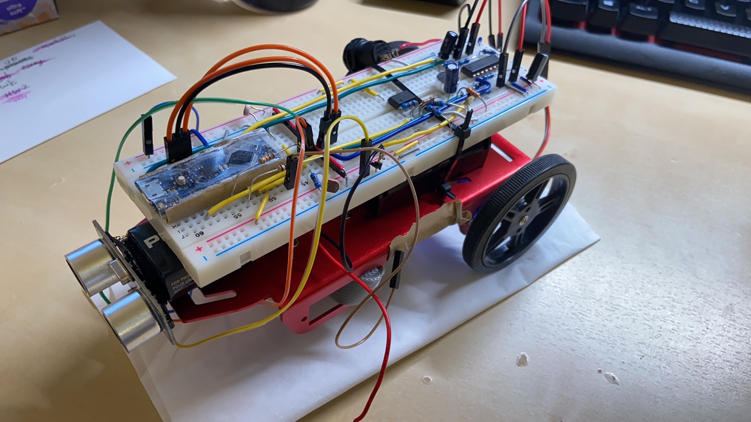 Then we programmed the Arduino with our plan and successfully completed the demo video. The demo video can be found below by clicking the image (it should take you to a YouTube video site). This demo video shows the complete process of me playing a sound, the robot detecting the sound and starts turning, and finally detects the obstacles along the way.