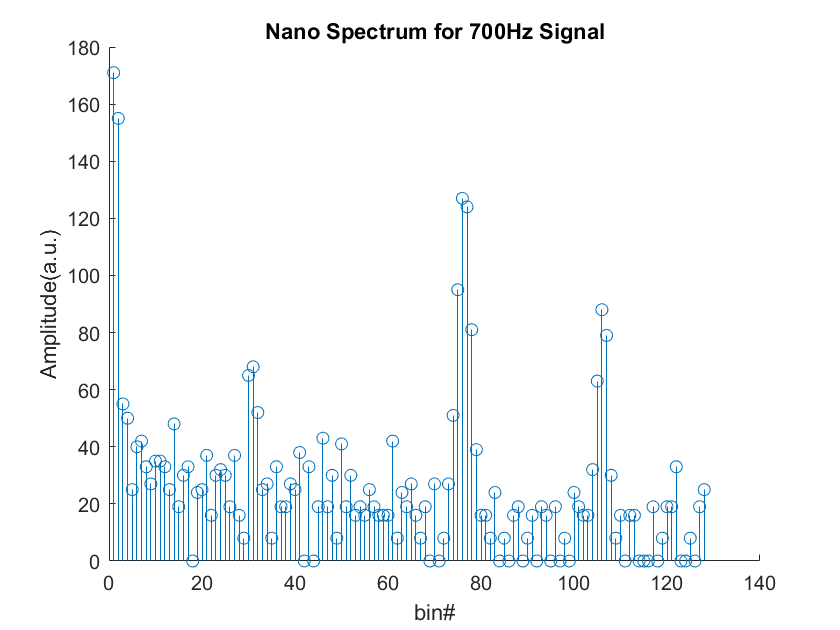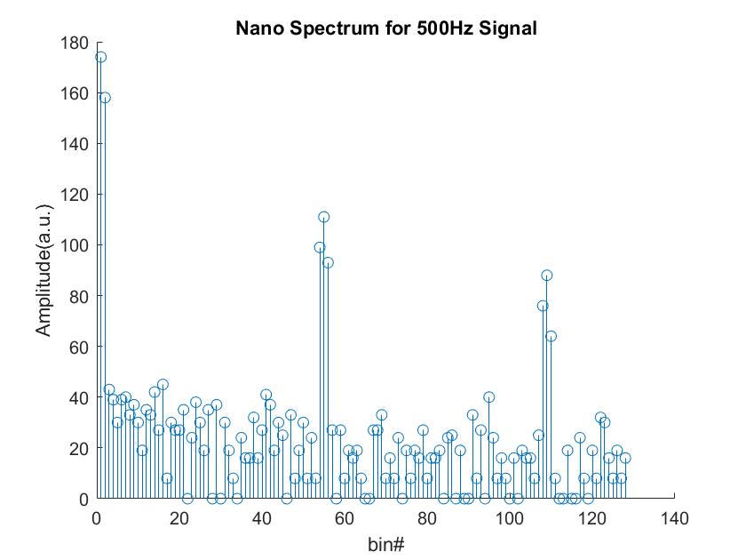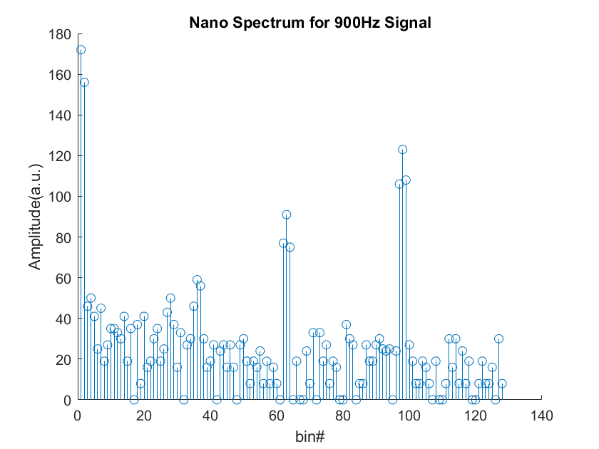 Fig.11 is the spectrum we contained with a sound frequency of 500Hz. We then repeated testing our code using sound frequency of 700Hz and 900 Hz, shown in Fig.12 and Fig.13.