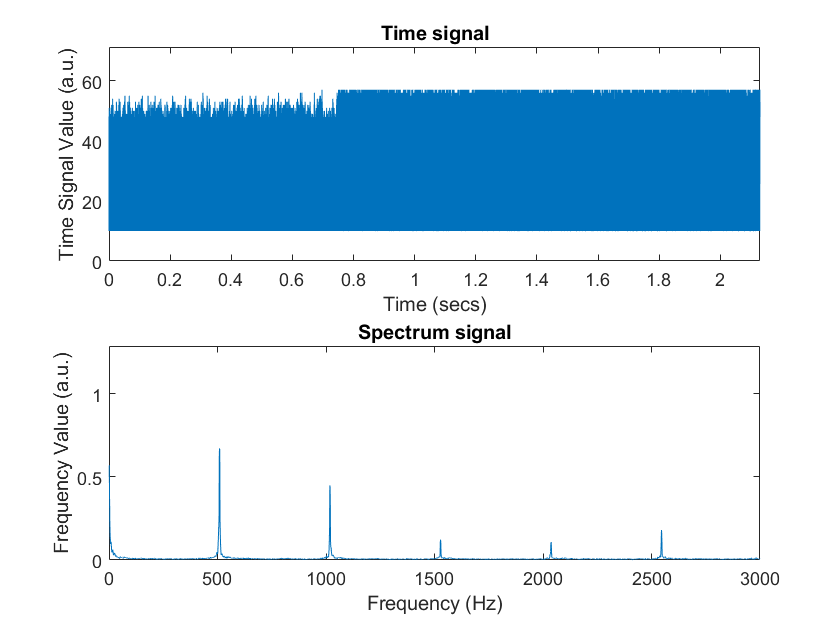 We tested the amplified circuit with the same procesure we did to test unamplified circuit. The MATLAB produced a graph shown in Fig.8. We observed that peaks at frequency 500Hz, 1000Hz, and 1500Hz are much higher than before, and at the same time, noises “dispeared” on the graph.