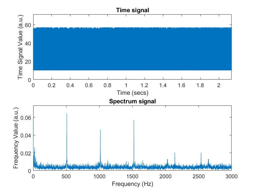To test the micropohone circuit, we coded our Arduino to collect sound and used MATLAB to perform fourier analyze. Instead of using analog_read(), we code ADC on the Nano and set it to Free Running Mode so that we can read its value by calling ADC0_read(). In MATLAB, we code it to generate sound with initial frequency of 500Hz, final frequency of 500.1 frequency, and sound duration of 2s. The MATLAB will also perfrom fourier analyze on data collected from arduino and generate a signal spectrum in the end. The sound was generated from our computer speakers when we run the MATLAB code, and the microphone was positioned close to computer speakers to collect data. After data collecting, MATLAB perfromed fourier analyze and produced graph shown in Fig.7. From graph, we can observe peaks at frequency 500Hz, 100Hz, and 1500Hz, but there are noises at other frequency values and spetrum’s values are relative weak at desired frequencies.